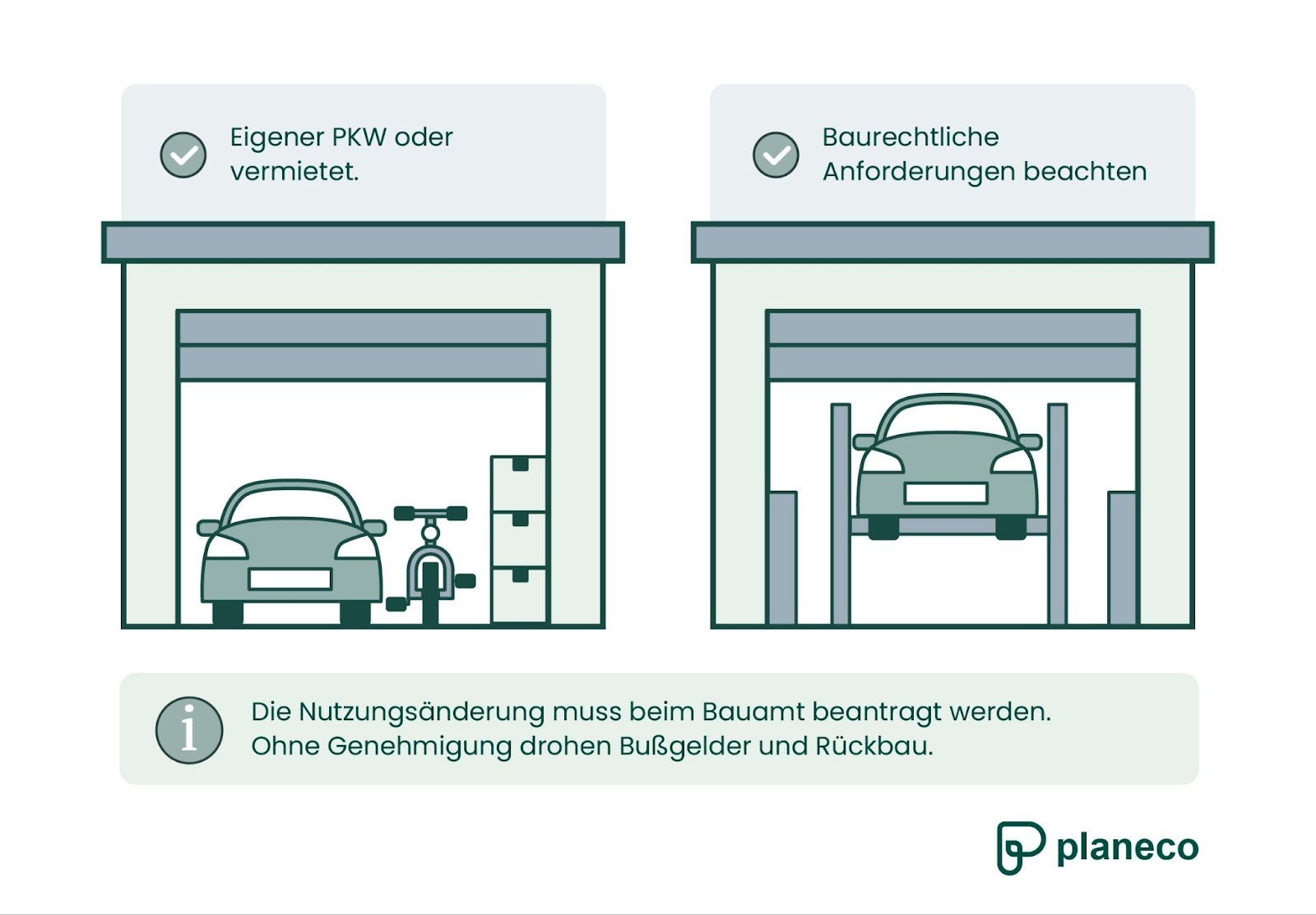- Gewerbliche Nutzung erfordert Genehmigung: KFZ-Werkstatt, Lagerraum oder andere private Zwecke braucht meist eine Nutzungsänderung.