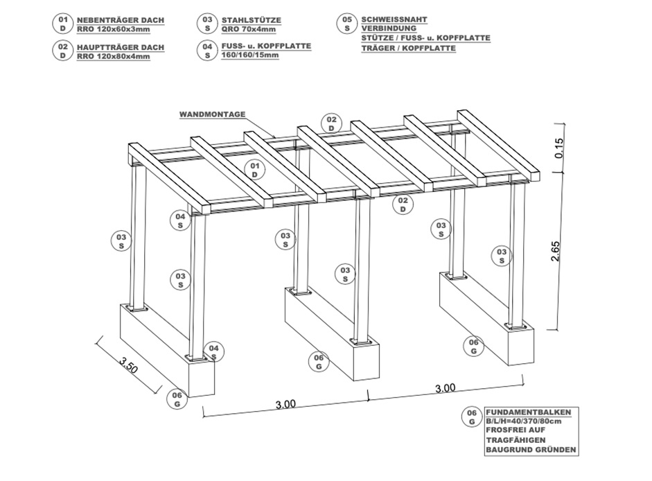 Wie im exemplarischen Positionsplan ersichtlich, gibt es unterschiedliche Angaben zu den einzelnen Bauteilen. Man sieht hier 6 Stützen auf drei Streifenfundamenten mit insgesamt 9 Trägern.Die Position der Bauteile wird über die individuelle Positionsnummer zugeordnet, die als eingerahmte Nummer, Buchstabe oder mit beidem abgebildet ist. Neben der Position visualisiert der Positionsplan, das Material, die Achsen, die Spannrichtungen und Bemaßungen der einzelnen Bauteile.